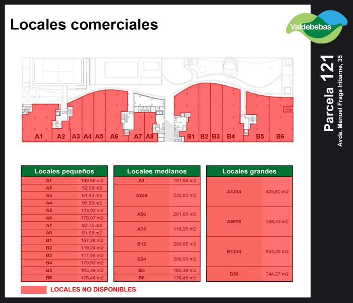 Comercializa, en régimen de alquiler, un total de 1.850 m2 de locales comerciales, superficie repartida en planta baja, con frente a la avenida que constituye el eje Norte-Sur de Valdebebas, con la posibilidad de configurar la superficie requerida por sus clientes.